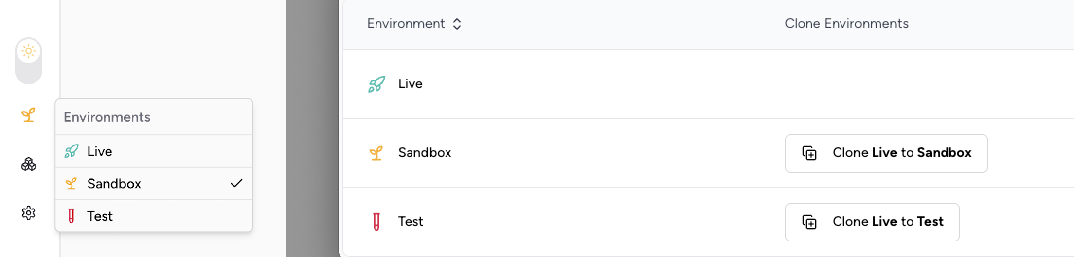 To ensure your testing environments accurately reflect production, you can clone configurations from the Live environment to either Sandbox or Test.