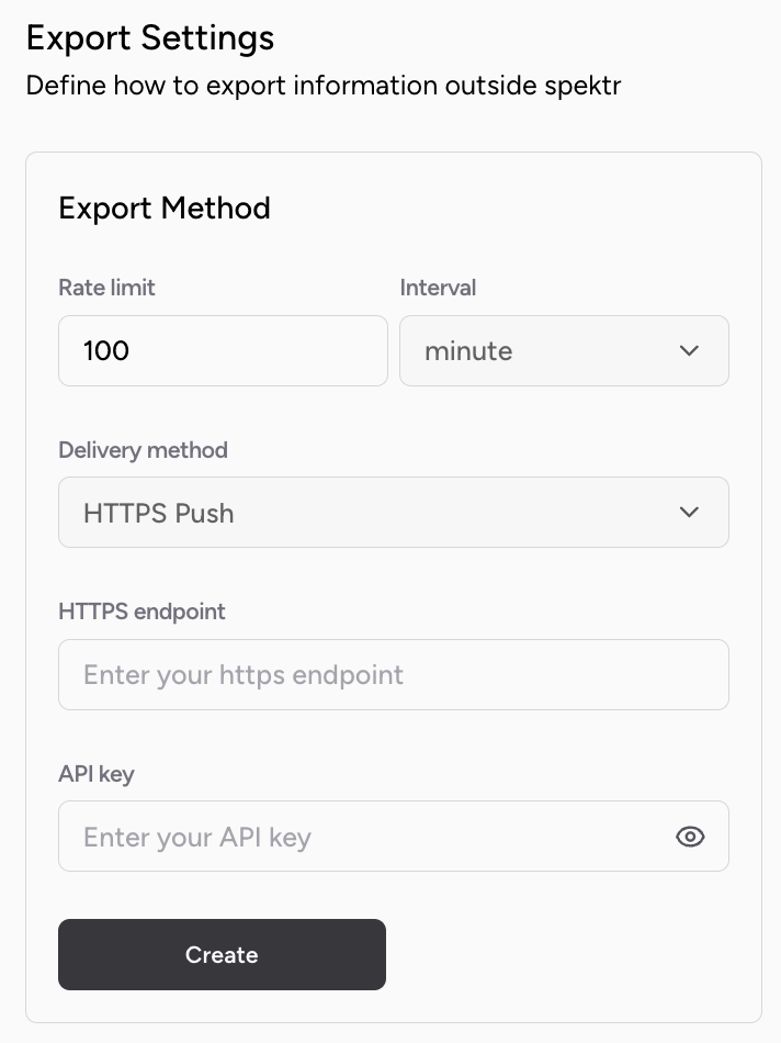 Webhooks provide a way for notifications to be delivered to an external medium (e.g. HTTPS push, slack) whenever certain events occur on spektr.