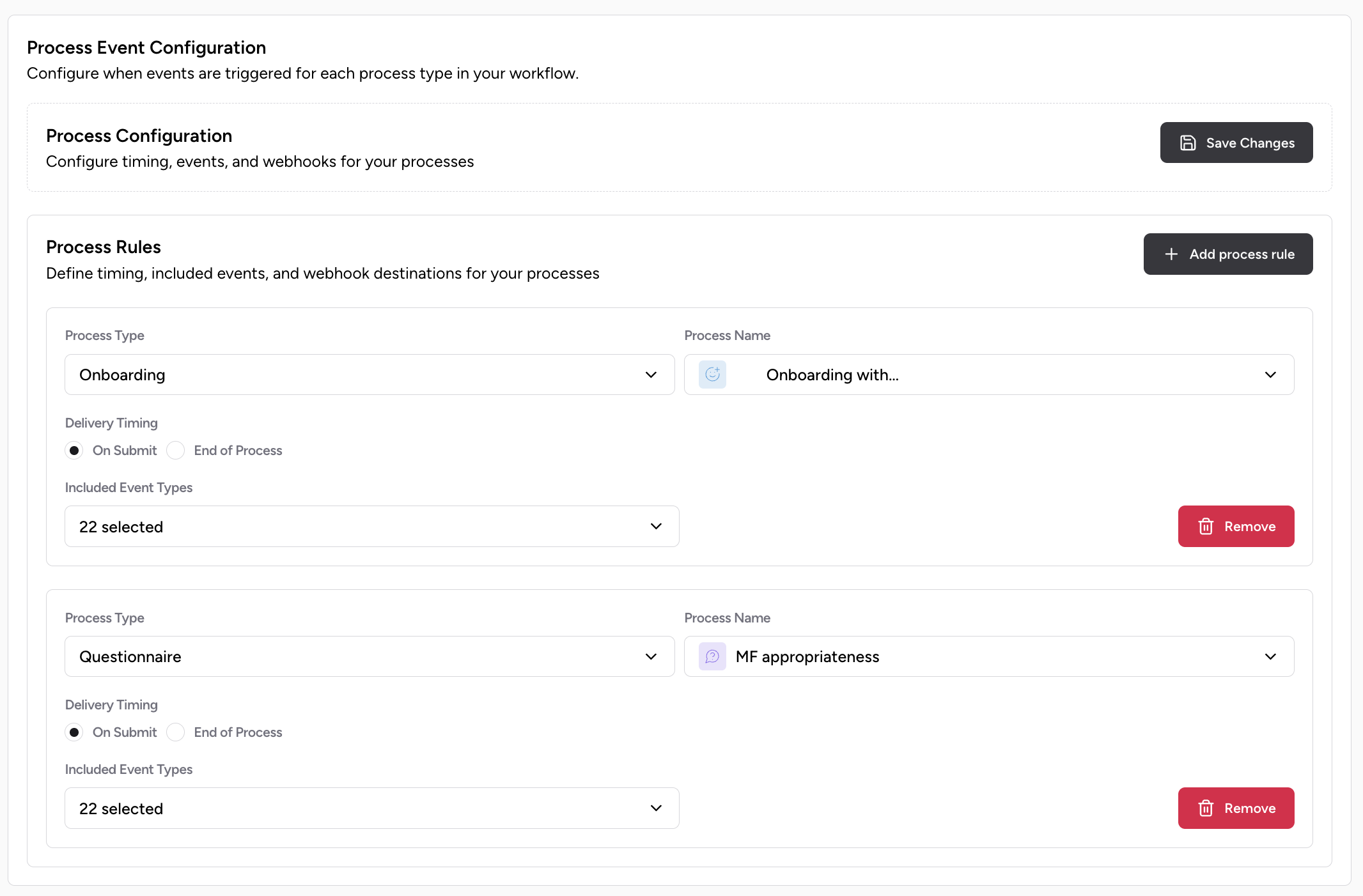- You can configure when you would like to receive the events. At the end of the process execution or right when the event was generated.